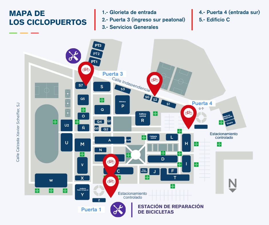 En el campus hay cinco ciclopuertos ubicados en el perímetro del campus.